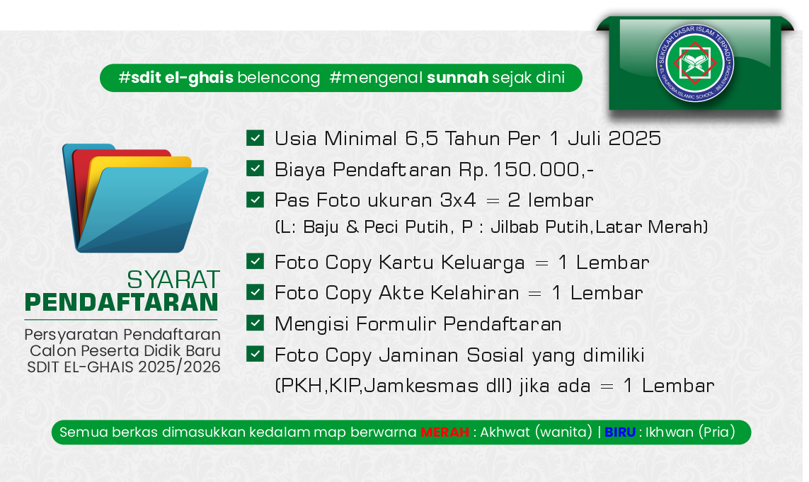 SDIT EL-GHAIS menyediakan PPDB secara online diharapkan proses PPDB dapat berjalan cepat dan bisa dilakukan dimanapun dan kapanpun selama sesi PPDB Online dibuka. Proses pendaftaran calon siswa baru di masa pandemi Covid-19 ini dan terhambat oleh jarak jika datang ke madrasah langsung, bisa mengakses website PPDB Online SDIT EL-GHAIS.